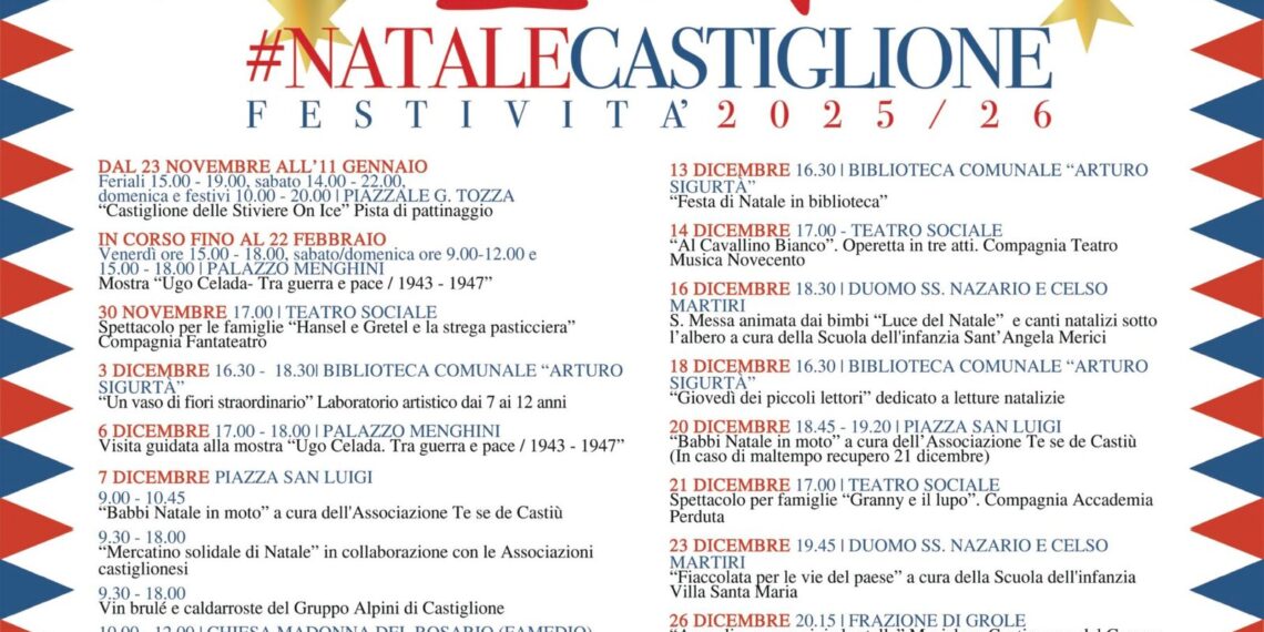 In Castiglione delle Stiviere, nestled in the hinterland of Lago di Garda, the Christmas spirit comes alive with a rich calendar of holiday events and initiatives designed for the 2025-2026 festive season. The program, curated by the local Administration, aims to celebrate local traditions and provide moments of gathering and enjoyment for all ages, transforming the city into a vibrant hub of festivity and culture. The Heart of the Festivities: Key Dates and Locations The celebrations will kick off on December 3 and run until January 6, 2026. A distinctive feature is the ice skating rink at Piazzale Tozza, already in operation and available for residents and visitors until January 11. The event lineup offers a wide range of activities, from creative workshops to performances, from markets to artistic and musical exhibitions that will accompany the entire period. Entertainment and Tradition for Everyone Youngsters will have the opportunity to participate in various playful and creative activities. The Sigurtà library will host a workshop titled “An Extraordinary Flower Pot,” while the Gallery of Palazzo Menghini will offer an initiative for creating Christmas lanterns, designed to immerse children in the festive spirit. On Sunday, December 7, Piazza San Luigi will become the focal point of activities with the traditional “Christmas Solidarity Market,” featuring participation from local associations, alongside the “Market of Used Toys and Books” organized by the schools of Castiglione delle Stiviere. The streets and squares will be animated by a parade of Santa Clauses on motorcycles, the roaming show of “Luminous Butterflies,” and Santa’s sleigh. Traditional flavors will abound, with the Alpini Group offering mulled wine and roasted chestnuts, accompanied by music and choral singing. A particularly evocative event will be the Living Nativity Scene, set up at the Castle, recreating an authentic village animated by numerous performers. It will be open to the public on December 26, January 1, and January 6. Music, Art, and Shows The artistic program includes significant events. On Monday, December 8, the Basilica of San Luigi will host a concert by the Junior Orchestra of the Cultural Musical Association. Families are invited to the Teatro Sociale on Sunday, December 21, to enjoy the show “Granny and the Wolf,” curated by Danilo Conti from Accademia Perduta. The cultural offerings are further enriched by the exhibition “Ugo Celada – Between War and Peace / 1943 – 1947” at Palazzo Menghini, running until February 22. Additionally, from December 13 to 31, the Mons. Don Rinaldo Dalboni Hall will host the exhibition “The Magic of the Nativity… a Dream of Peace,” curated by the Philatelic & Numismatic Circle. Among the evening events, the “Torchlight Procession through the Town” on December 23 stands out, starting from the Duomo SS. Nazario e Celso Martiri. The Administration’s Message Mayor Enrico Volpi commented on the initiatives, emphasizing the goal of providing citizens and visitors with an experience that combines tradition and creativity to celebrate the magic of Christmas. The Mayor expressed gratitude to all the associations collaborating with the Administration in realizing the program. Italian Version