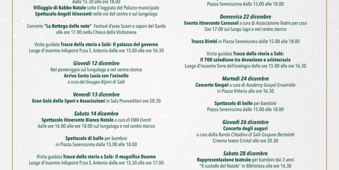 Christmas 2024 in Salò promises to be filled with unmissable events, thanks to a calendar organized by the Municipality of Salò, the Tourism Department, and the Pro Loco. The festive atmosphere will enliven the historic center, the main squares, and the lakeside with activities designed for all ages, including shows, music, markets, and cultural traditions.