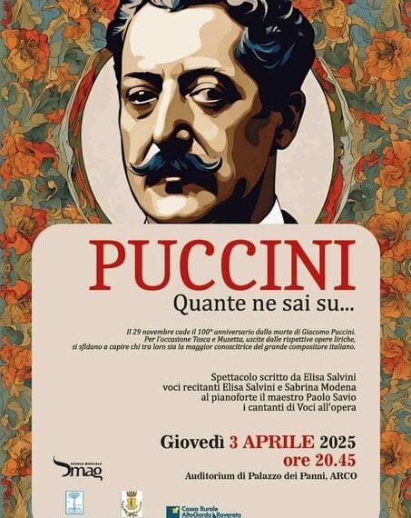 A special event will take place on April 3rd at the auditorium of Palazzo dei Panni, as part of the Thursday series of the La Palma Cultural Circle. The Alto Garda Music School presents an evening dedicated to Giacomo Puccini, one of the most renowned opera composers in history, marking the centenary of his passing. This lyrical concert will not only be a musical performance but also an engaging narrative game that will enrich the audience’s experience.