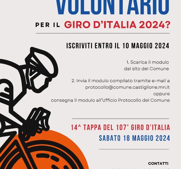 The Municipality of Castiglione delle Stiviere is looking for volunteers to help organize the Giro d’Italia, which will take place on May 18, 2024. If you are interested in participating as a volunteer, you have until May 10, 2024 to sign up.