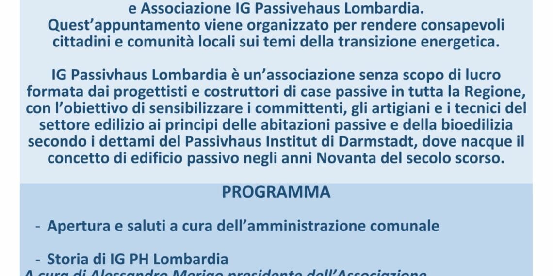 The event program includes various segments. It will begin with the opening and official greetings by the municipal administration, introducing the guests and setting the context of the meeting. Following that, Alessandro Merigo, the president of the IG Passivehaus Lombardia Association, will present the history of the association, highlighting its commitment to promoting passive houses.
